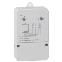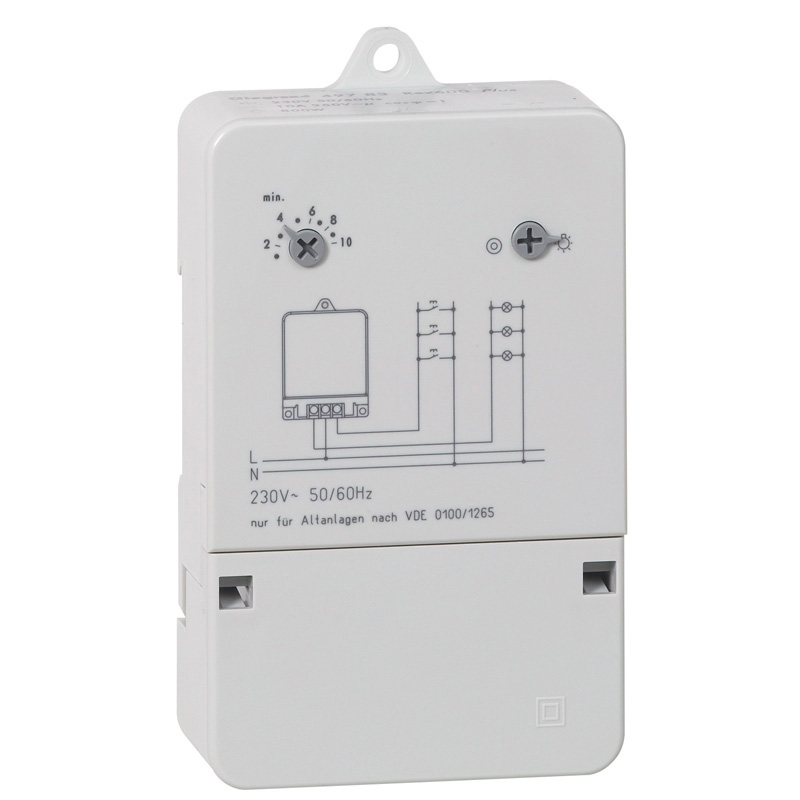 Minuterie électronique saillie - alimentation 230 V - 50/60 Hz - contact 250 V - 10 A - réglage de 30 s à 10 minimum - dimensions 125 x 72 x 34 mm
