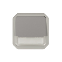 Plexo poussoir inverseur lumineux avec porte-étiquette - contact NO + NF - 10A - 250V - livré sans boîte de montage en surface ou cadre encastré - IP55 IK08 - gris