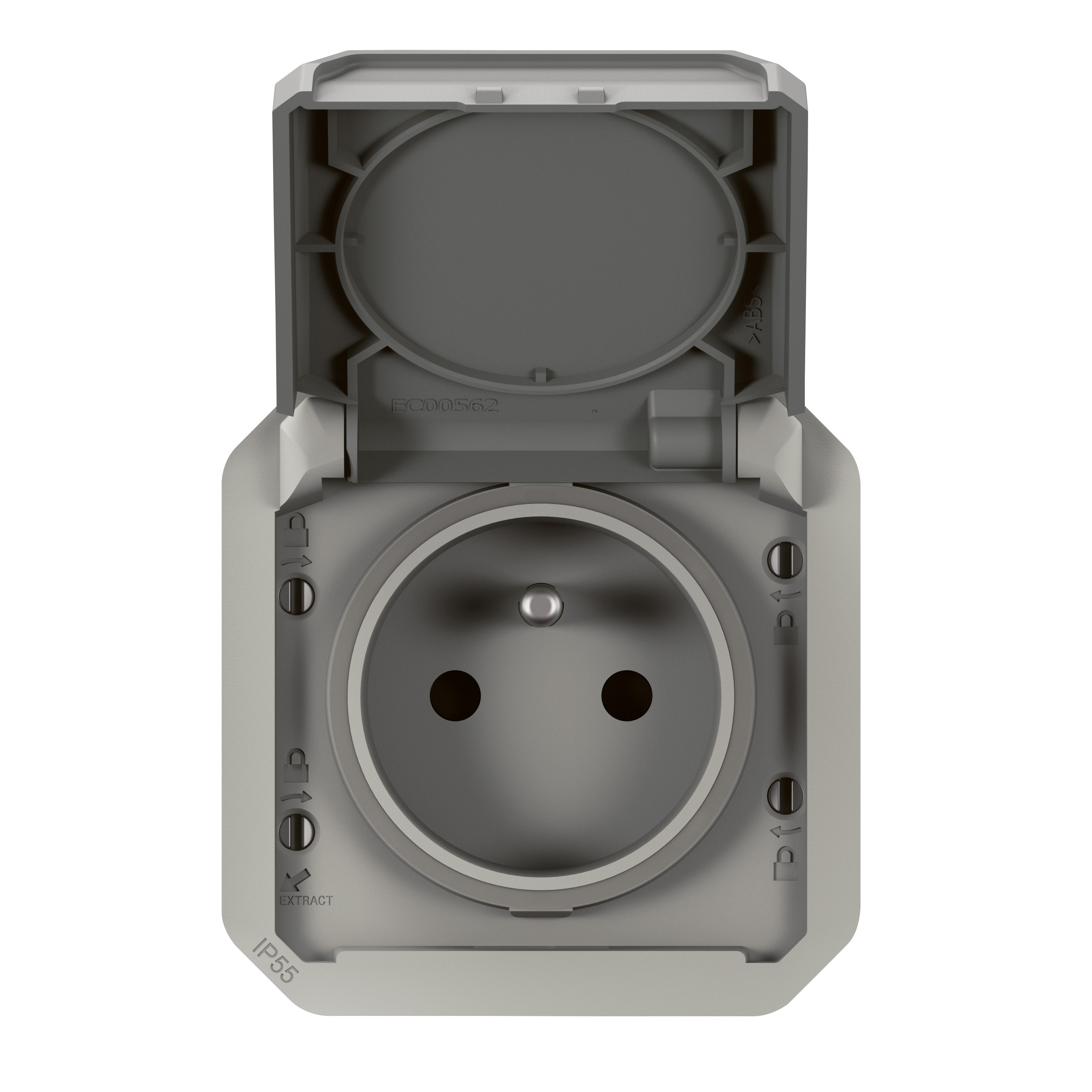 Plexo prise de courant 16A - 250V - simple avec bornes automatiques - 2P + T - livré sans boîte de montage en surface ou cadre encastré IP55 - IK08 - gris