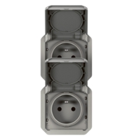Plexo Prise de courant 16A - 250V - double précâblée avec bornes automatiques - 2 x 2P + T vertical - livré sans boîte de montage en surface ou cadre encastré IP55 IK08 - gris