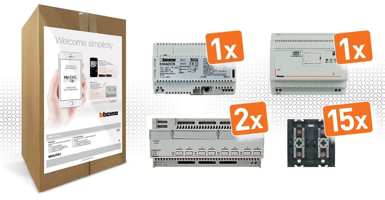 MyHOME_Up - Kit de démarrage avec alimentation de base + 2 x actuateurs BMSW1005 + la passerelle Myhomeserver1 + 15x commandede base L4652/2