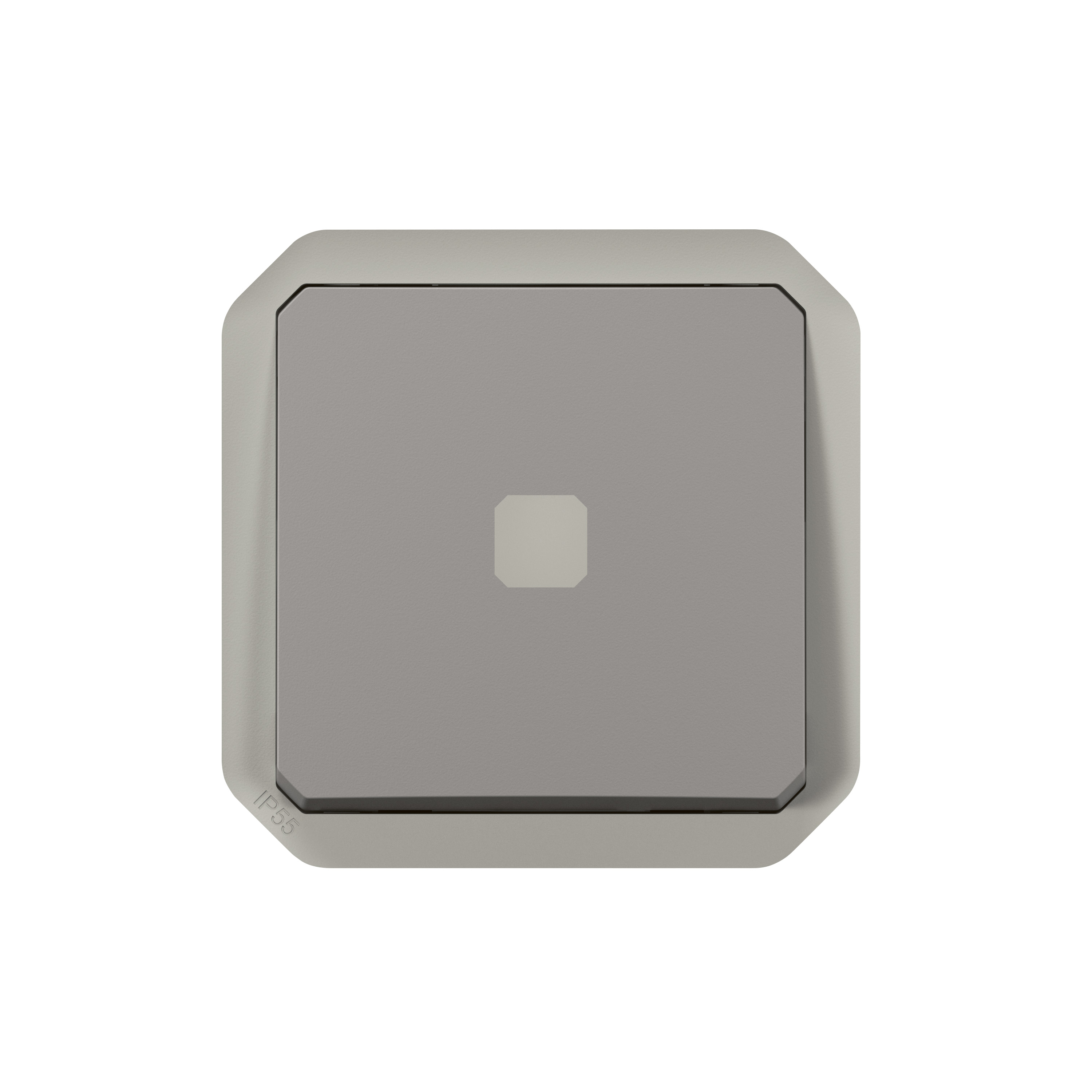 Plexo wisselschakelaar 250V 4AX. met controle lamp zonder nul-aansluiting. 60W min tot 1500W max. - los mechanisme geleverd zonder opbouwdoos of inbouwkader - IP55 IK07 - grijs